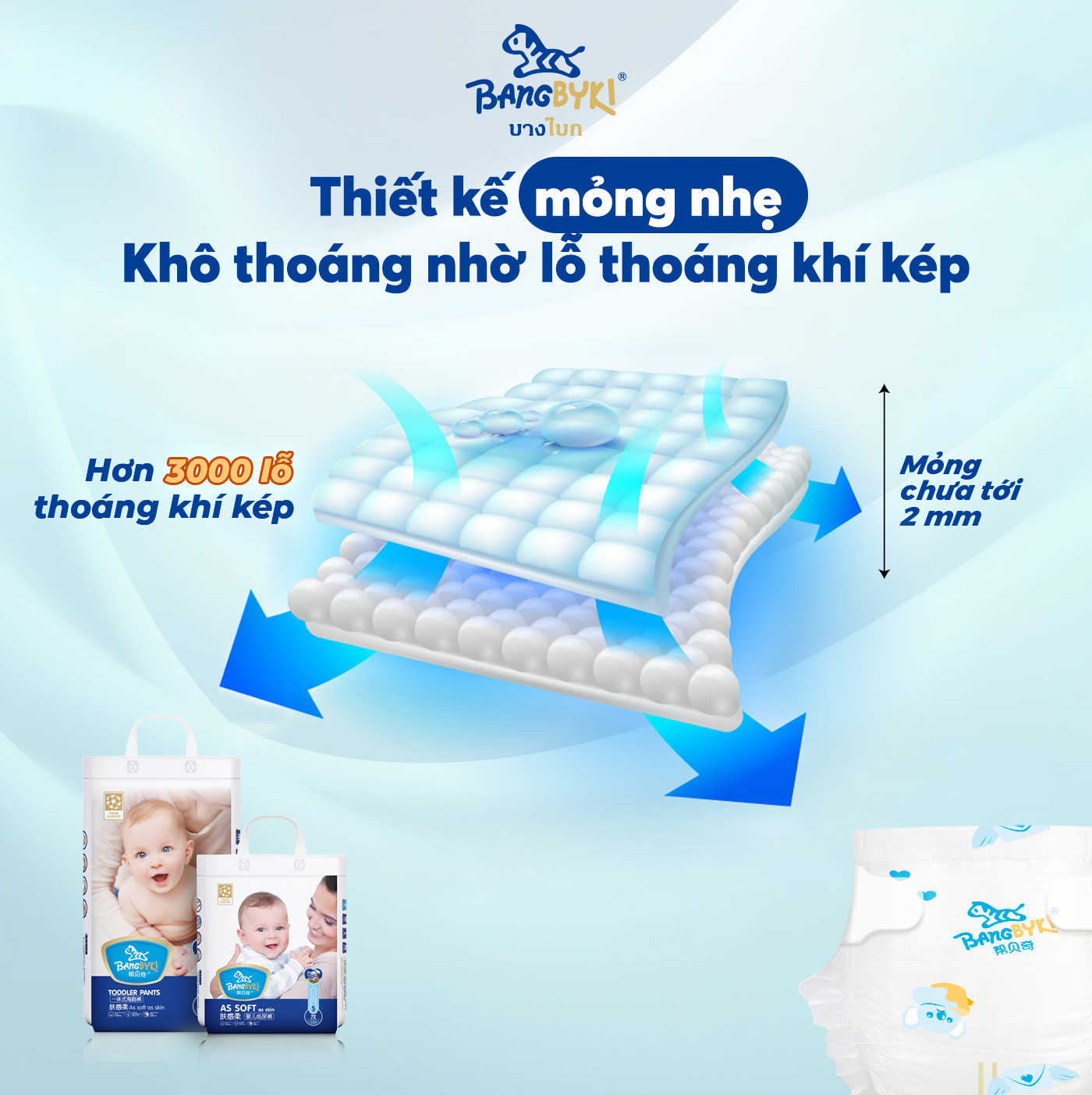 – Thoáng hơn: với nhiều lỗ thoáng khí kép, Bangbyki giúp chất lỏng đi xuống nhanh chóng, mông con luôn khô thoáng, mịn màng.