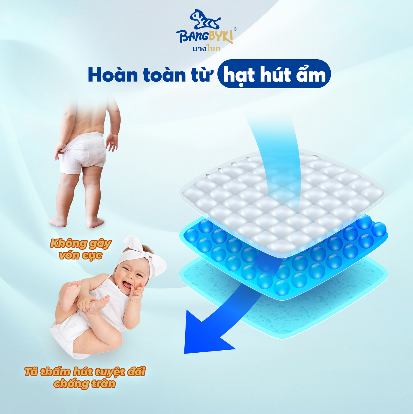 1. Sử dụng công nghệ hạt siêu thấm hút SAP hiện đại mới nhất trên thị trường giúp Bangbyki là chiếc tã được các mẹ Thái săn đón với những ƯU ĐIỂM VƯỢT TRỘI: