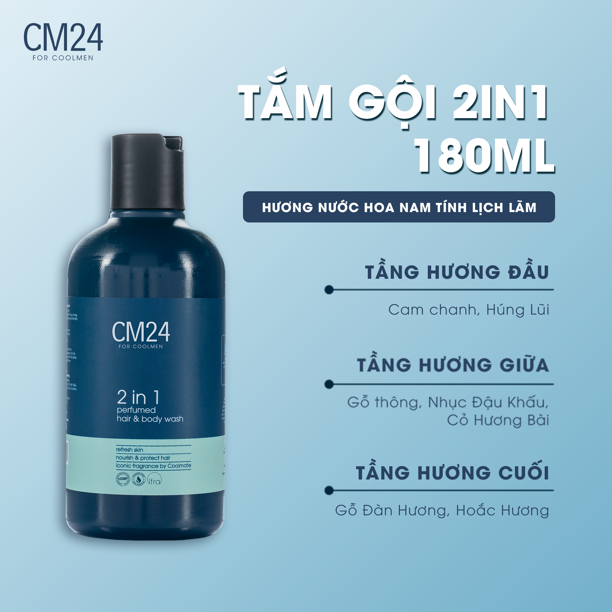 1. Tên sản phẩm: Tắm gội nam 2in1 CM24 hương nước hoa 180ml