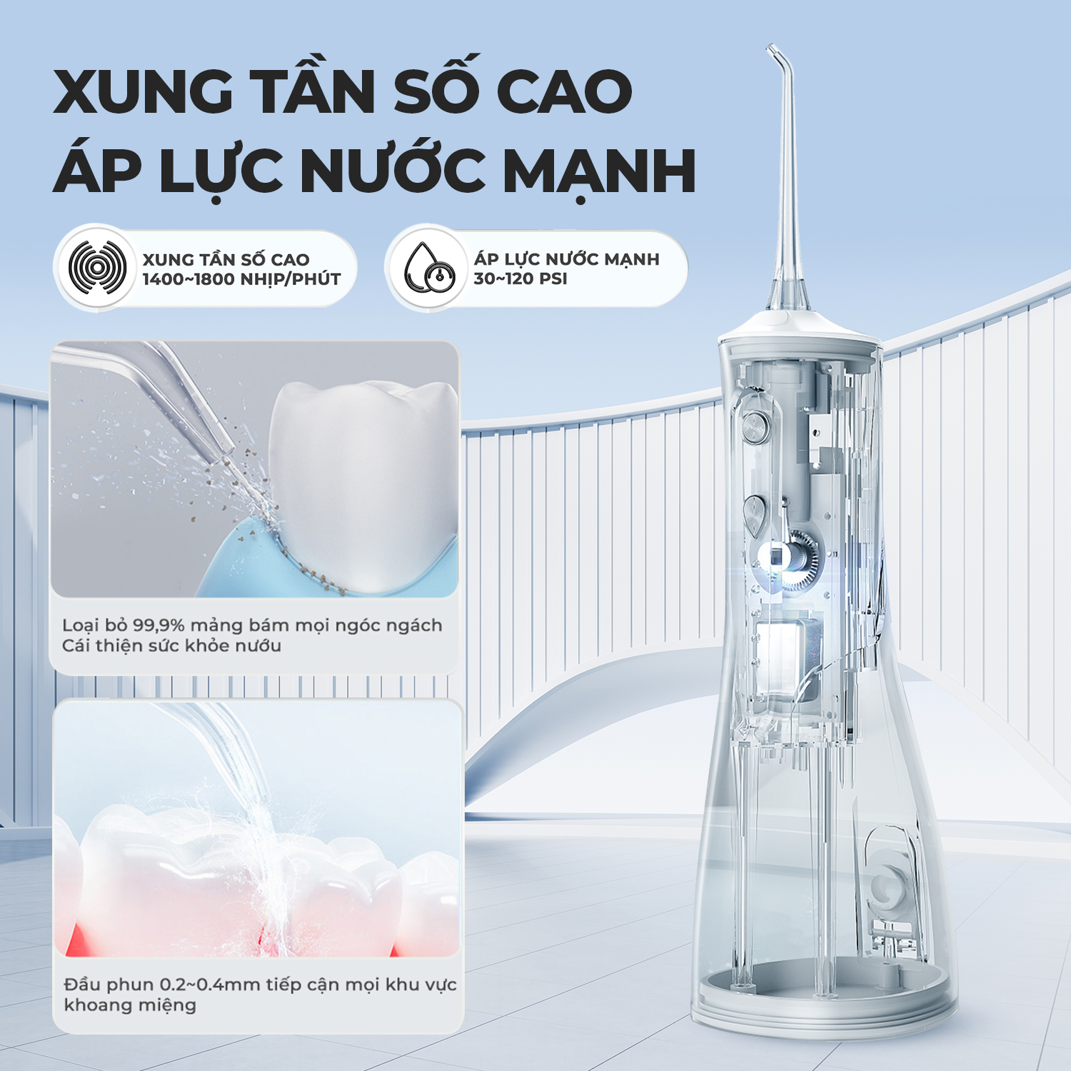 - Đầu phun 0.2~0.4mm tiếp cận mọi khu vực khoang miệng