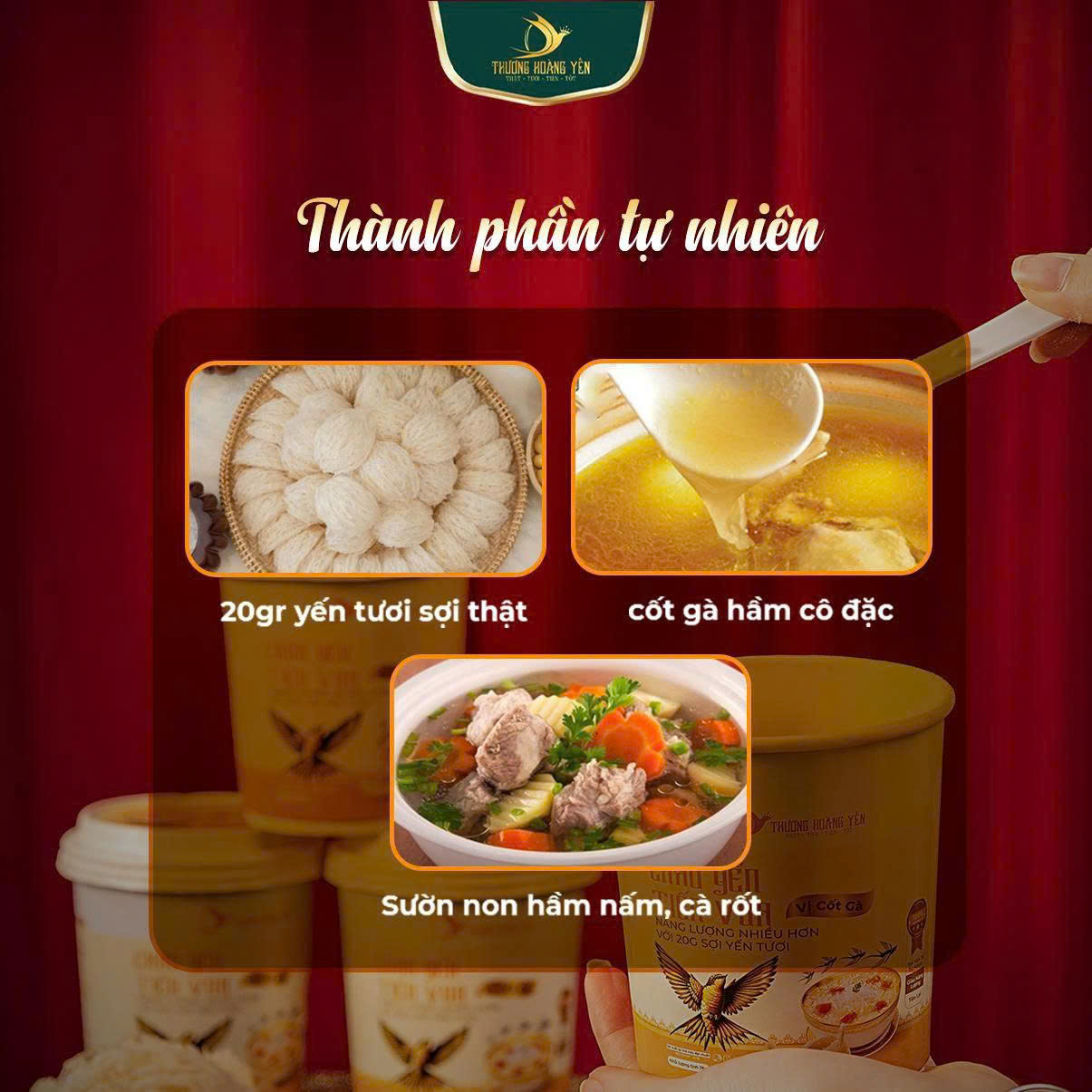 + THÀNH PHẦN Cháo yến vị cốt gà: Gạo được nấu bung sấy thăng hoa, 20gram Yến tươi, 1 gói cốt gà cô đặc trong 3 giờ, 1 gói dầu.