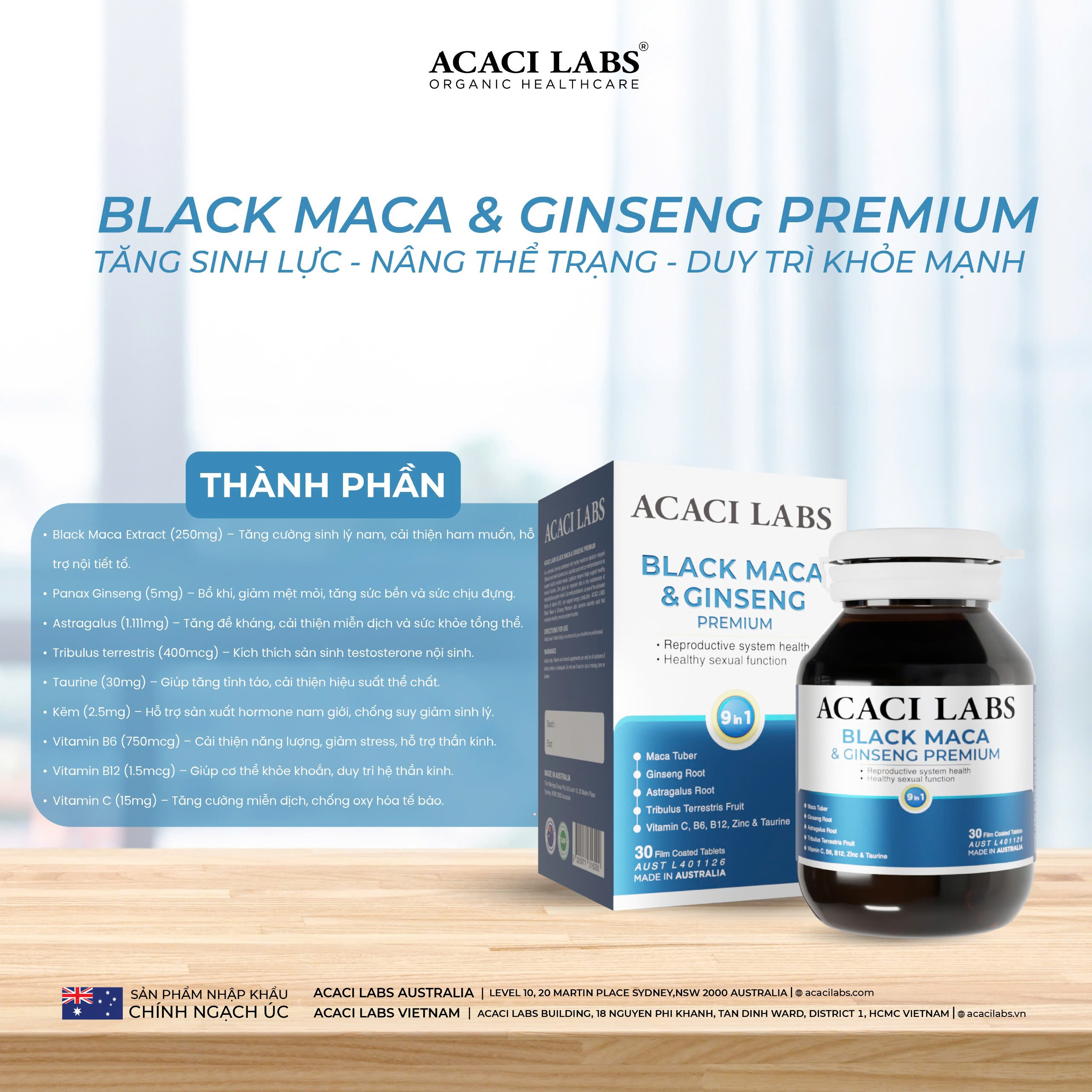 Viên uống bổ thận tráng dương tăng cường sinh lý Acaci Labs Black Maca & Ginseng Premium Australia 45v