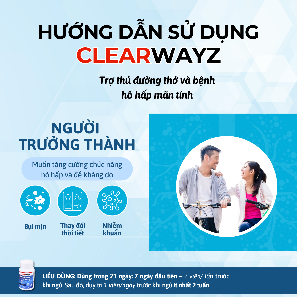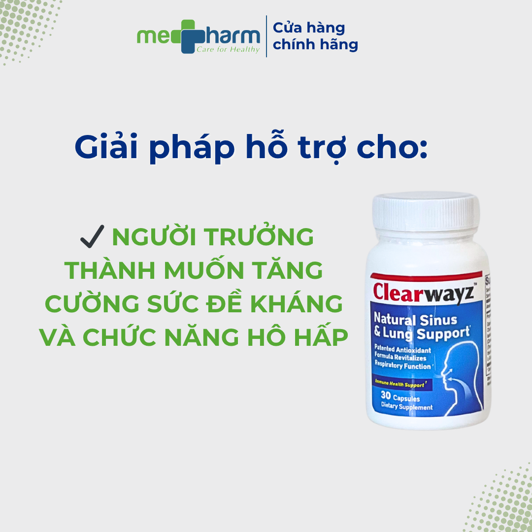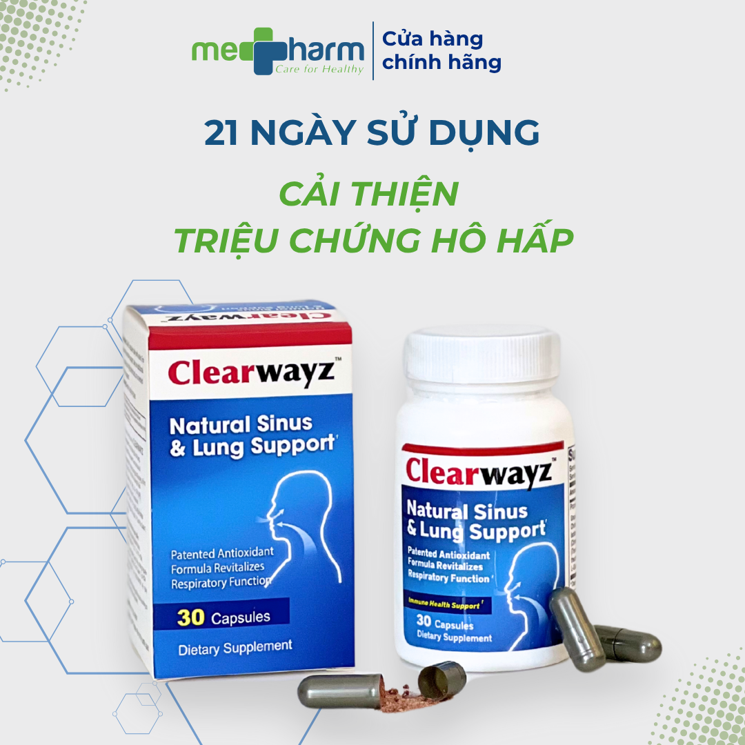 Clearwayz là thực phẩm bảo vệ sức khỏe đến từ Hoa Kỳ, được thiết kế đặc biệt để hỗ trợ tăng cường sức khỏe đường hô hấp một cách chủ động. Với công thức phối hợp nhiều dưỡng chất sinh học và chiết xuất thực vật chuẩn hóa, Clearwayz không chỉ giúp chống oxy hóa và tăng đề kháng.